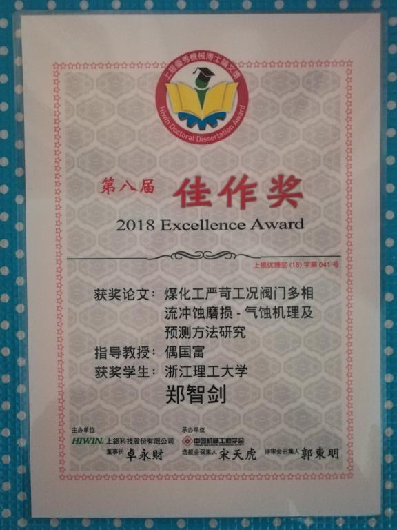 11月8-10日,由中国机械工程学会主办的第八届上银优秀机械博士论文奖颁奖典礼在四川成都新华宾馆隆重举行。公司机控公司博士生郑智剑(指导教师:偶国富)的博士论文“煤化工严苛工况阀门多相流冲蚀磨损-气蚀机理及预测方法研究”获得佳作奖。