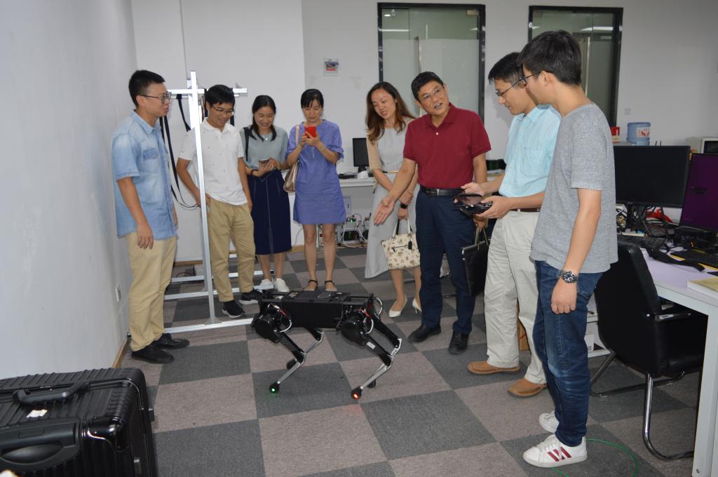 首先,在王兴兴员工的陪同下,潘海鹏一行参观了公司的研发部门及公司备受关注的Laikago四足机器人“网红产品”。王兴兴介绍,这款四足机器人具有强劲的动力性能和运动稳定性。Laikago整机有12个高性能电机,总瞬时最大功率为18KW,功率质量密度0.8KW/Kg,已经可以实现基本上下坡草地、简单的平衡功能并保证运动的稳定性。王兴兴通过设计电机、驱动器及整套控制系统和部分传感器,大大提高了机器人集成度。保证它能在复杂情况下都有保持良好的稳定性。当提到为什么从大疆离职投身创业时。王兴兴谈到因为自己从小就喜欢科技,在研究生期间独立设计的XDog正好被国内外媒体广泛报道,于是就在2016年8月离职,创立了宇树科技。之后从尺寸、体型、动力性能规划出发,按设计需求全新独立研发了电机、电动驱动及主控、整机机械结构以及全新重构的控制系统,打造了全新的四足机器人“Laikago”。