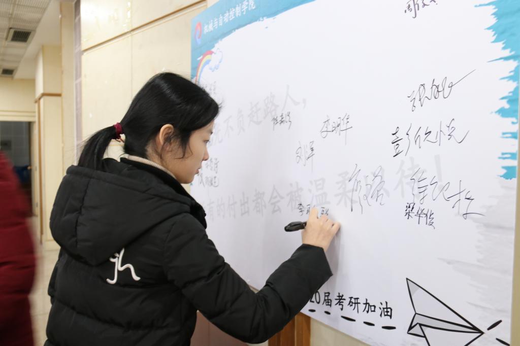12月4日上午,机控公司在活动中心5楼多功能厅成功举办2020届毕业生考研慰问激励大会。公司副经理俞高红教授,公司党委副书记王吴芳以及16级辅导员房维维、王淯霄出席。会议由王淯霄主持。现场近300考研学子到场,他们纷纷在考研墙上签名。