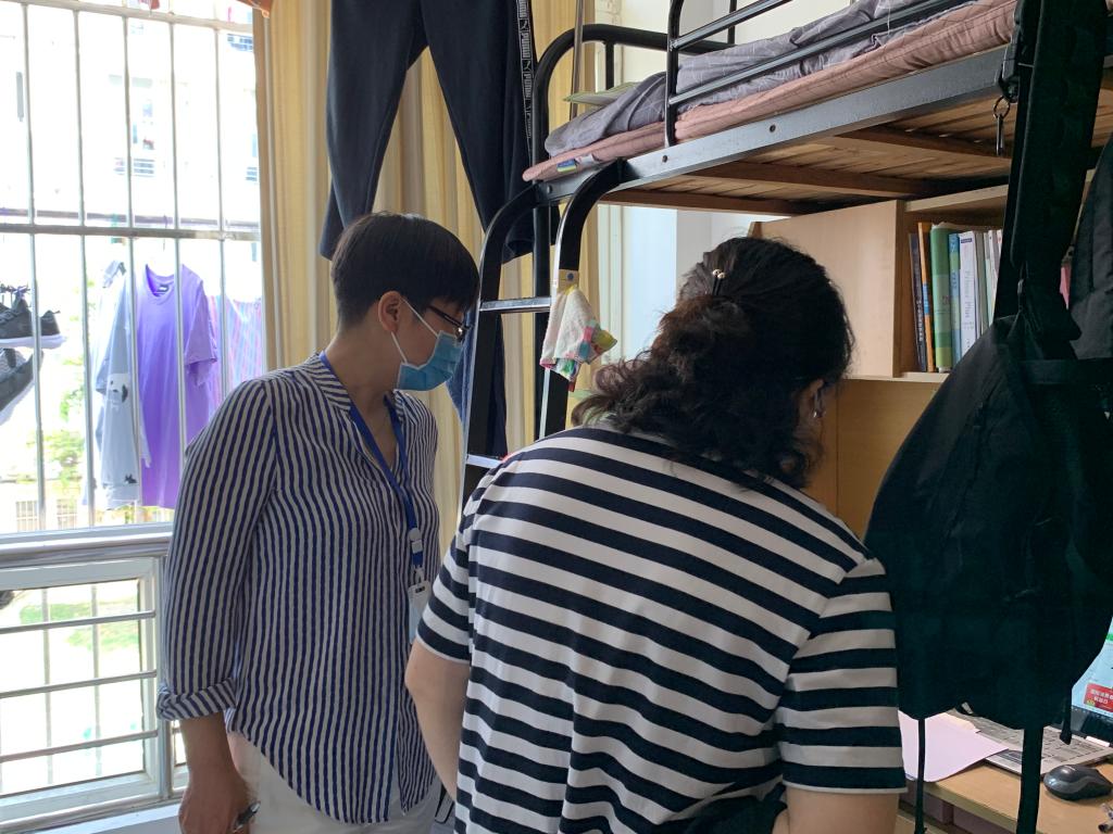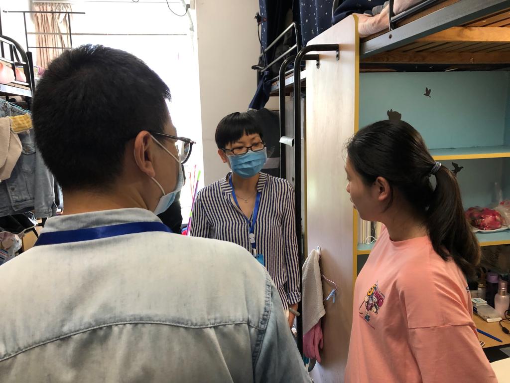 胡明一行走访了生活一区2号楼大一女生寝室,了解女同学学习生活的情况。胡明仔细询问了员工上网课的情况,询问了员工返校后对于疫情防控的看法。她强调,特殊时期要增强自身学习的自觉性和主动性。随后,胡明一行走访了B7、A2等员工楼,每位老师就员工毕业设计、考研、找工作等情况进行了询问和指导。