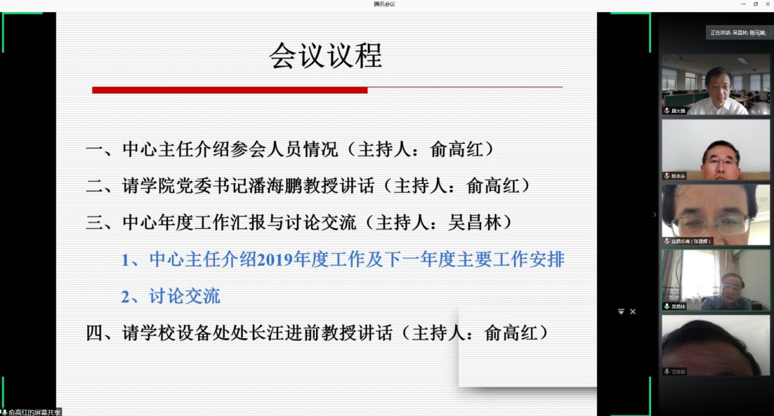 会议第一阶段,由公司党委书记潘海鹏教授讲话,向各位专家介绍了示范中心的基本情况。随后,由俞高红就2019年度中心基本概况、人才培养、科学研究、教学研究、仪器设备研制和改装、中心队伍建设、信息化建设、中心示范与交流以及在团队队伍培养、国际交流与合作、标志性高水平研究成果等中心主要存在的问题向各位专家进行了汇报,并提出了中心下一年度的发展思路。教指委几名专家分别就示范中心2019年度的报告对中心的建设提出宝贵的意见和建议,最后,委员会主任吴昌林教授肯定了示范中心2019年的各项工作,并指出了目前存在的一些问题。