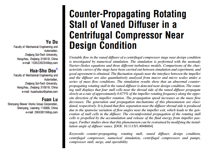 近期,公司硕士研究生杜昱同学以第一作者身份在国际著名期刊《ASME Journal of Turbomachinery》发表长达19页(双栏)的研究论文,论文题目Counter-Propagating Rotating Stall of Vaned Diffuser in a Centrifugal Compressor Near Design Condition(离心压缩机近设计工况叶片扩压器的反向传播旋转失速),通讯作者为导师窦华书教授。