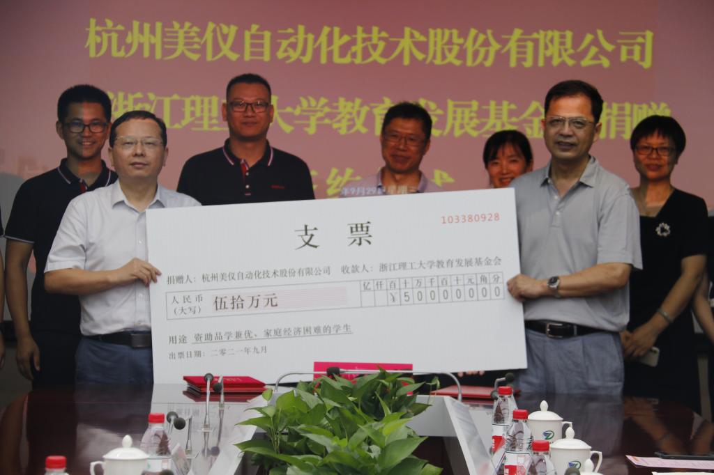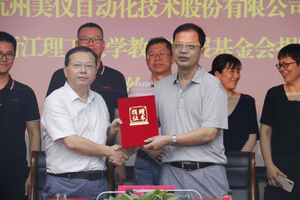 会上,杭州美仪自动化技术股份有限公司向公司捐赠人民币伍拾万元整,设立“美仪奖学金”。陈建勇与丁程签订捐赠协议,并为丁程颁发捐赠证书。