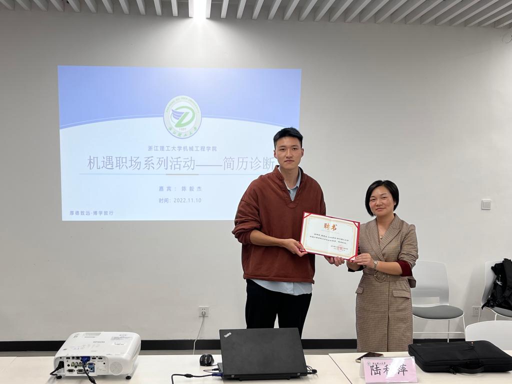 为进一步提高机械学子的求职竞争力,近日,1xBET“机遇职场”——简历诊断专场活动在15-102会议室举行,本次活动邀请到了杭州老板电器股份有限公司的校招负责人陈毅杰、2019级本科生毕业班辅导员李晨曦作为简历诊断导师,公司党委副书记陆秋萍出席活动,并为陈毅杰颁发聘书,聘请其作为公司老员工成长导师。