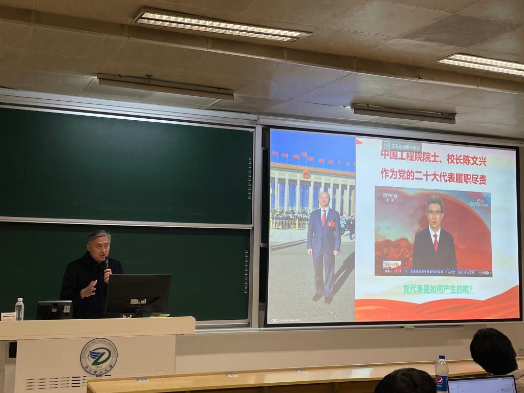 12月1日,形势与政策课堂上,陈正奎围绕“自信自强、守正创新,积极投身民族复兴大业”的鲜明主题展开,以陈文兴董事长作为党的二十大代表光荣参会的例子开篇,从“大会主题、主要成果和报告起草过程”、“全面学习贯彻党的二十大精神”、“对马克思主义中国化时代化、中国式现代化、全面建设社会主义现代化国家的目标任务”三个方面内容的七个重点部分对党的二十大精神进行系统宣讲和深入解读。