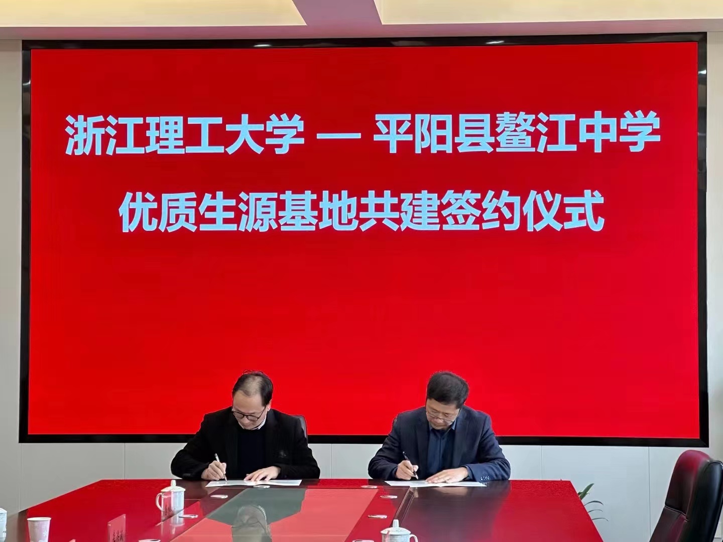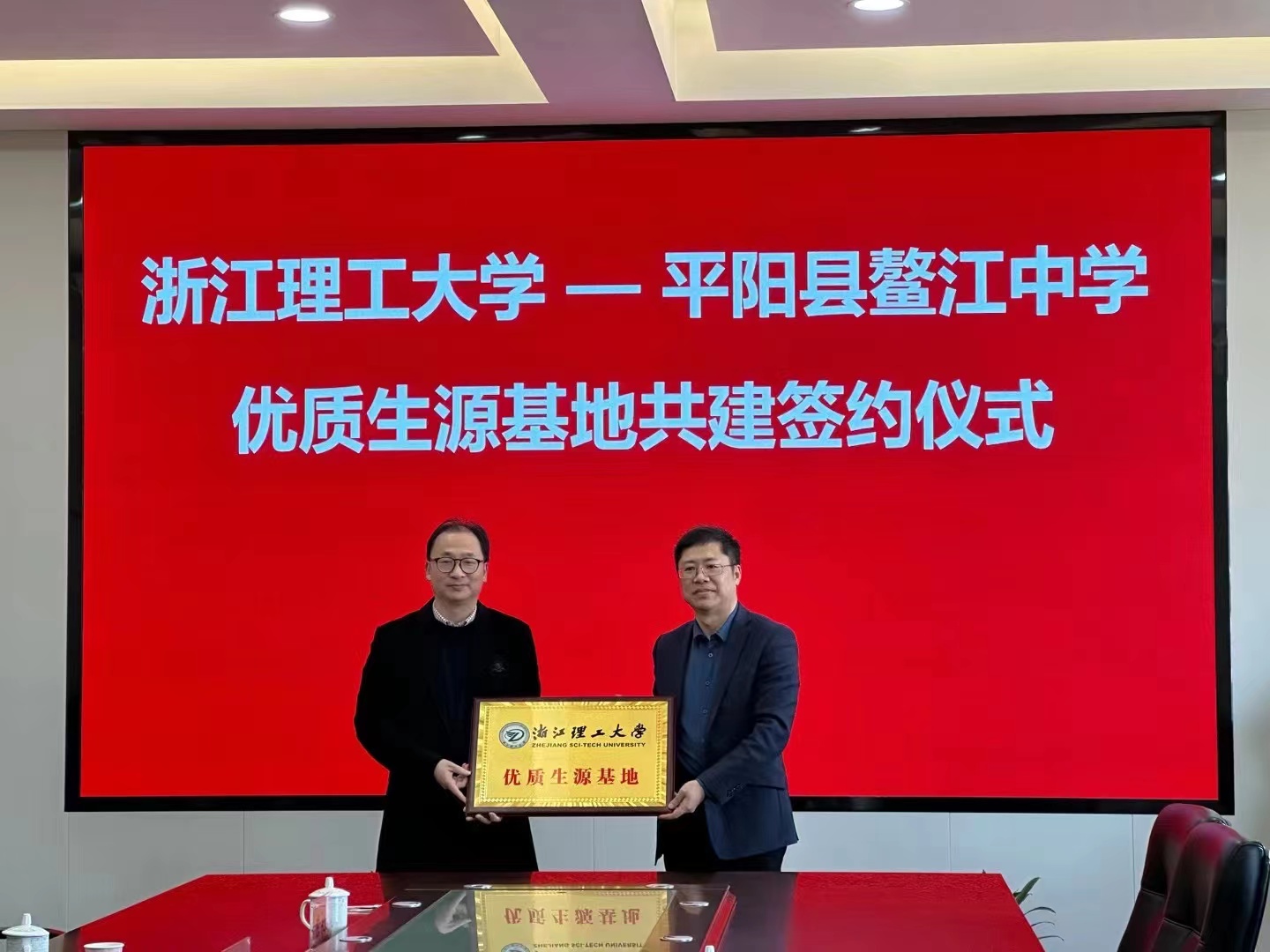 苏志俭与林浩代表双方公司签订《优质生源基地协议书》。苏志俭代表1xBET授予浙江省平阳中学“优质生源基地”称号,林浩代表平阳中学接牌。