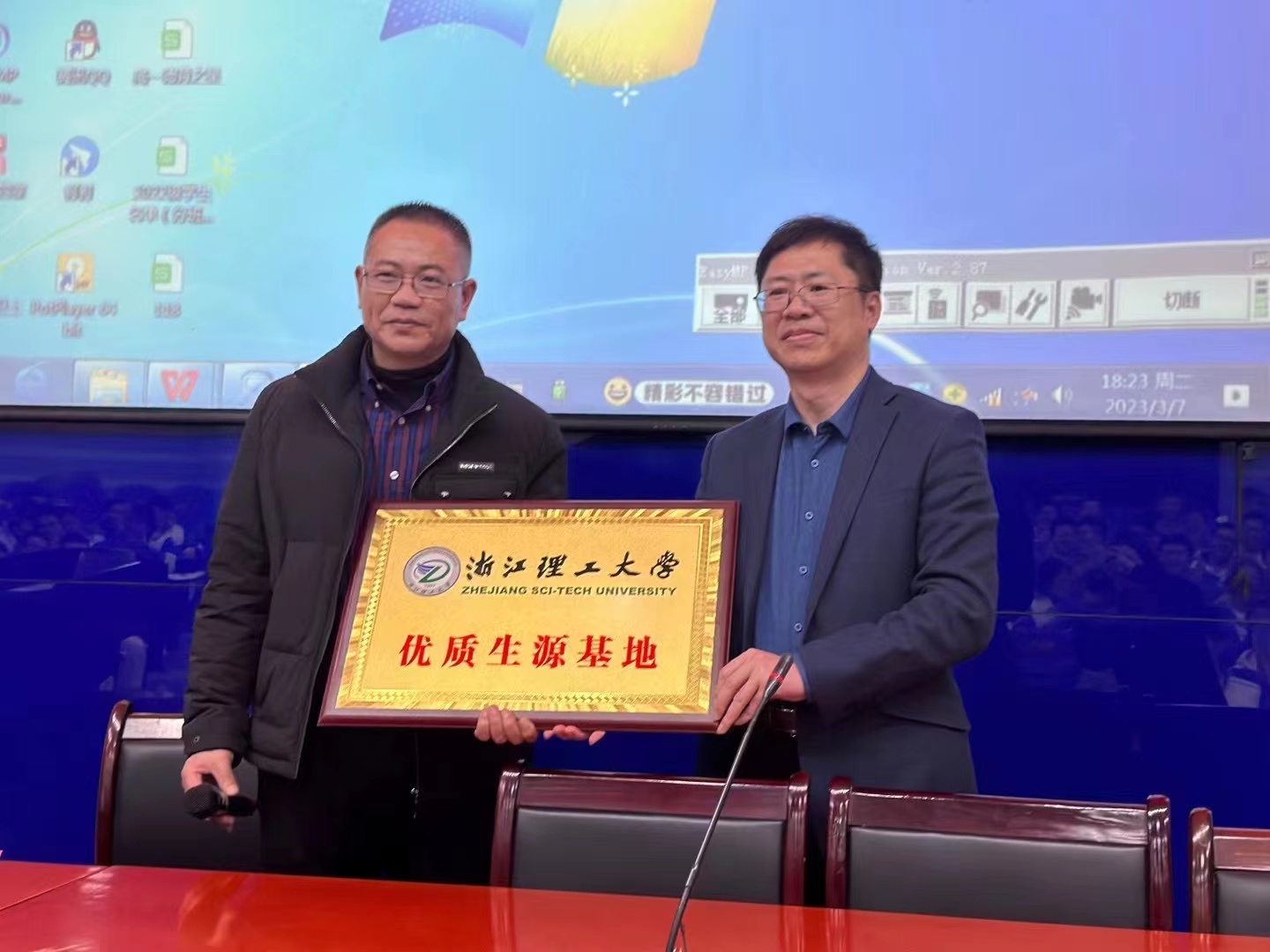 苏志俭与李伟君代表双方公司签订《优质生源基地协议书》。苏志俭代表1xBET授予平阳县鳌江中学“优质生源基地”称号,李伟君代表鳌江中学接牌。