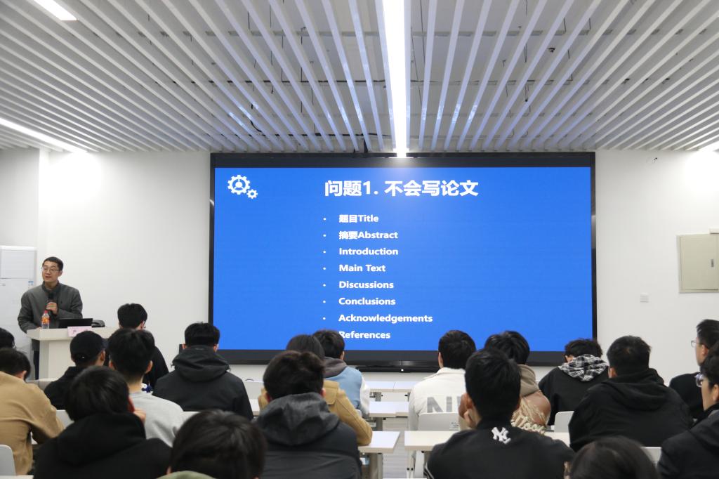 开营仪式结束后,由公司学术副经理严博作《关于科学研究能力提升的一些思考》专题培训,严博从研究生最困惑的七个核心问题出发,围绕论文撰写、文献检索、前沿动态把握、科学问题提出、实验设计、结果分析、创新点挖掘分享具体的方法和技巧,为研究生们指点迷津。