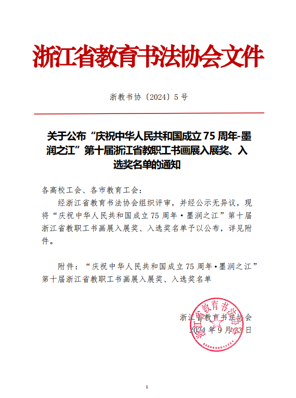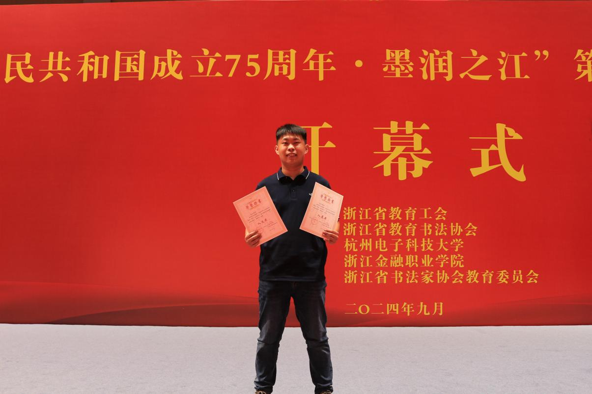 近日,由浙江省教育工会指导,浙江省教育书法协会主办的“庆祝中华人民共和国成立 75 周年·墨润之江”第十届浙江省教职工书画展作品征集工作已结束。经专家评审、公示和复核,公司辅导员李家乐的书法作品《已亥杂诗》获入展奖、国画作品《墨荷图》获入选奖。