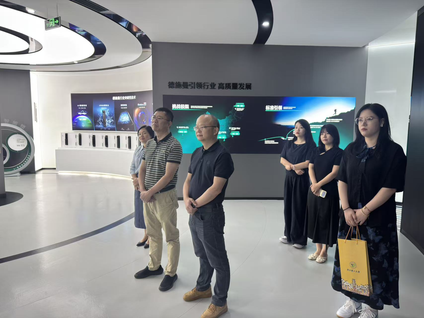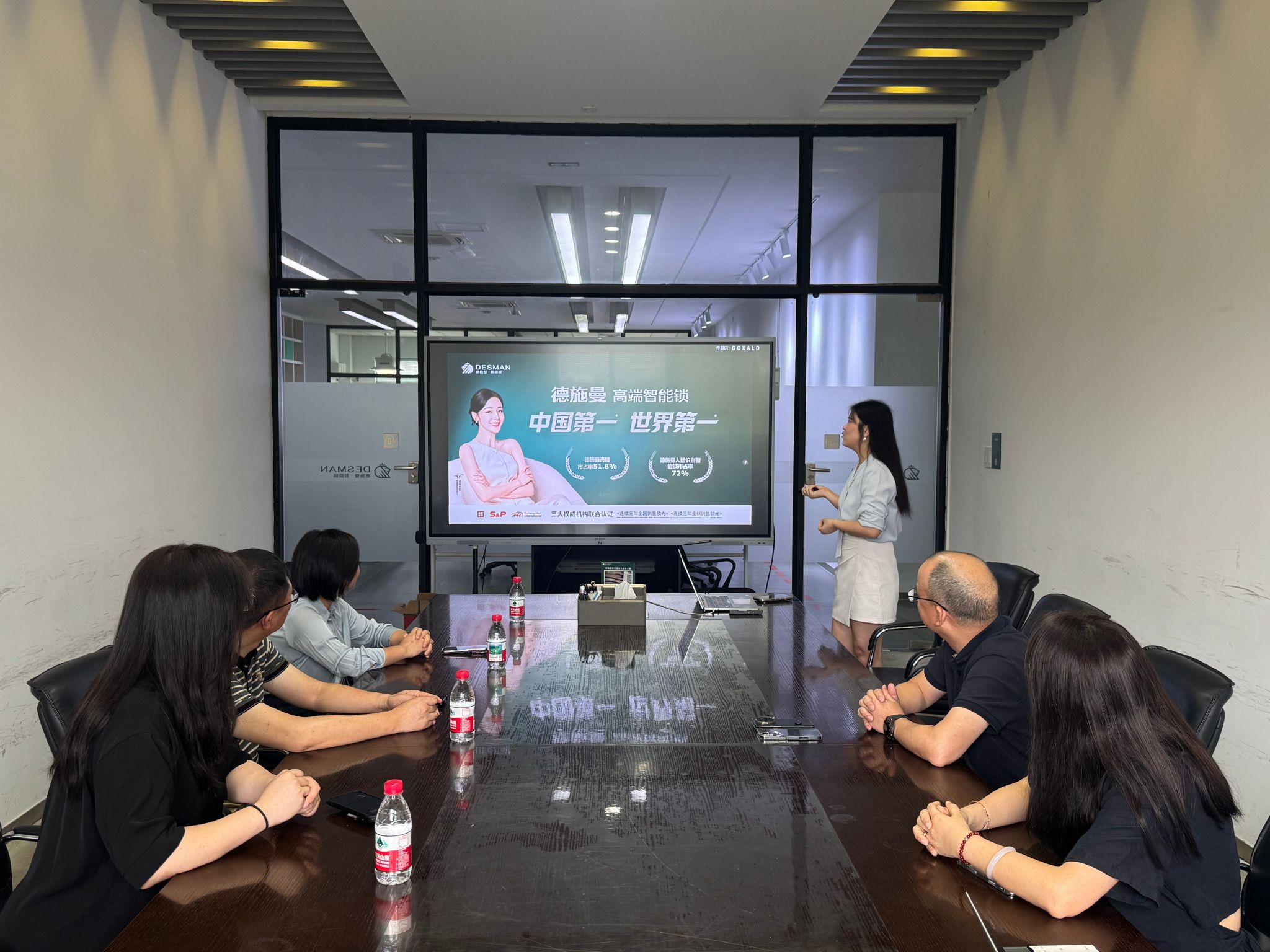 在董启广员工的陪同下,苏志俭一行首先参观了企业品牌大厅。通过沉浸式展示与技术讲解,团队深入了解了德施曼专注于高端智能锁产品的自主研发与制造的发展历程——自2009年创立以来,企业秉承 “用科技让生活更简单” 的使命,已成长为集研发、制造、销售于一体的全产业链龙头企业,连续十三年稳居全国智能锁销量前列。展厅内,从首创带屏智能锁开启人机交互时代,到3D人脸锁、AI虹膜锁等颠覆性产品引领行业革新,200多项专利技术的陈列,生动印证了企业 “严谨创新、追求极致” 的发展理念。