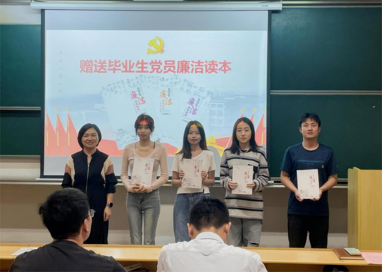 紧接着,陆秋萍为毕业生党员带来一堂廉洁专题党课。围绕浙理廉洁因子,结合《中国共产党章程》、《中国共产党纪律处分条例》、《中国共产党廉洁自律准则》等读本要求,运用丰富的廉洁楷模故事和警示案例,强调每一名党员必须“扣好人生第一粒扣子”,在遵守党纪上做到严要求,在廉洁自律上追求高标准,始终做到忠诚、干净、担当。党课最后,陆秋萍代表公司向毕业生党员赠送了公司自主整理编撰的廉洁读本,勉励毕业生党员步入工作岗位,必须秉持廉洁从业的原则,发挥工匠精神,精益求精,为实现党的使命和人民的期待贡献自己的力量。