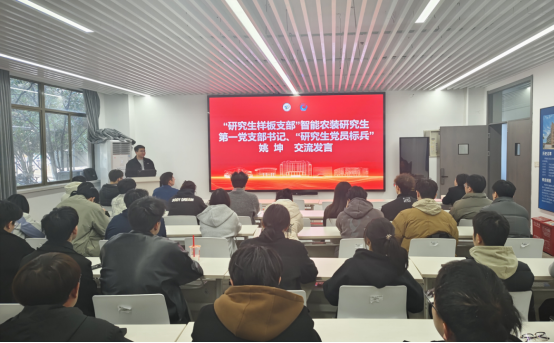 随后,第四批全省高公司党建工作“研究生样板支部”智能农装研究生第一党支部书记、“研究生党员标兵”姚坤进行了交流发言。姚坤从创新组织生活形式、强化党员教育管理、特色志愿活动品牌创建、推动党建与科研融合发展等多个维度分享了支部的经验和做法,为各支部开拓思路、创新发展提供了宝贵的借鉴。