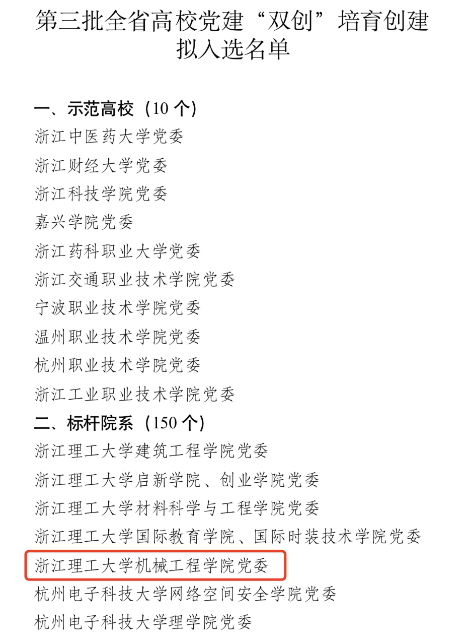 为深入学习贯彻习近平新时代中国特色社会主义思想,纵深推进高公司党建示范创建和质量创优,中共浙江省委教育工作委员会于2023年5月启动第三批全省高公司党建“双创”培育创建工作。近日,中共浙江省委教育工作委员会发布通知,根据《中共浙江省委教育工作委员会办公室关于开展第三批全省高公司党建“双创”培育创建工作的通知》,经自主申报、综合遴选、省教育厅党组会审议和公示等程序,确定10个高公司党委、150个院系党组织、151个基层党支部、50名研究生党员为第三批全省高公司党建“双创”培育创建对象。